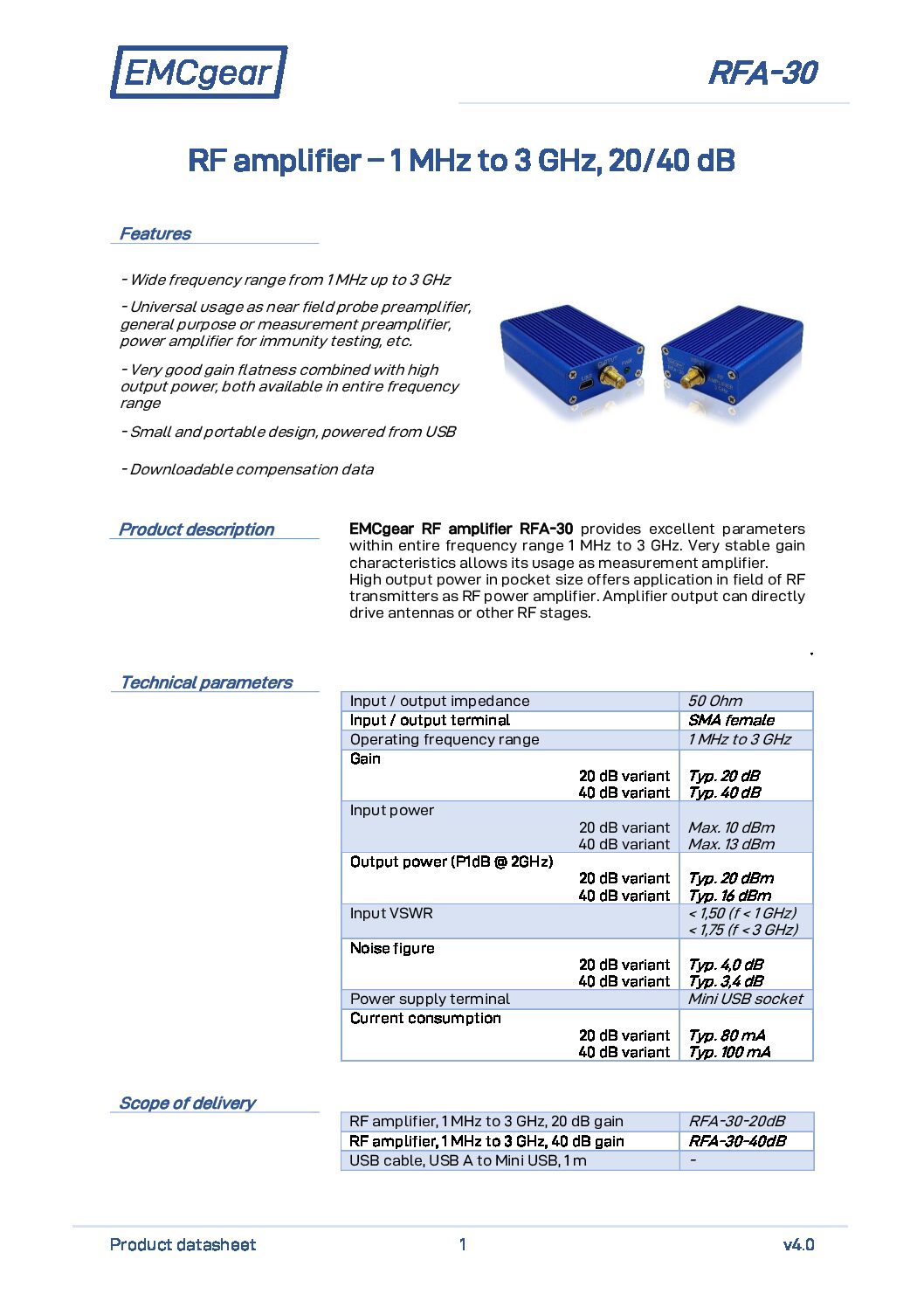 EMCgear RF amplifier RFA-30 provides excellent parameters within entire frequency range 1 MHz to 3 GHz. Very stable gain characteristics allows its usage as measurement amplifier.